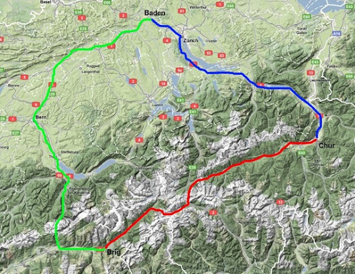 На карте маршрут Glacier Express (участок Бриг - Кур) обозначен красной линией. Зеленая и синяя линии - это наш путь туда (Баден - Бриг) и обратно (Кур - Баден). Получается, чтобы прокатиться 4,5 часа на Glacier Express (Бриг - Кур), мы потратили дополнительно почти 6 часов на дорогу.